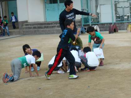 さて、これは何をしているところでしょう?ヒントは、日陰とひなたの境目に注目です。そうです、お日さんが当たるところと、当たらないところの温度差を調べています。おもしろいですね。2枚目の写真は、太陽の当たらない地面をさわった子どもが、次は太陽のあたる地面をさわりにダッシュしているところです。