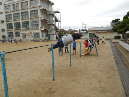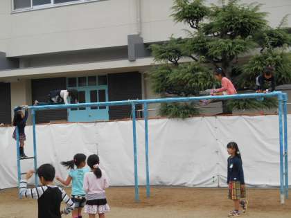 朝の運動場です。1枚目、うんていに低学年の子どもがちょこんと乗っています。正直言って、ひやひやして見ています。3枚目の写真、「プロペラやって。」と言うと、「ええー。」と言いながらすぐにやってくれました。見事でした。