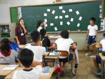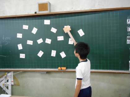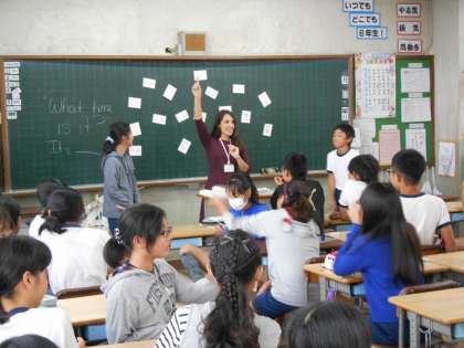 6年生の英語をのぞきました。メラニー先生と河村先生が、進めてくれています。今日は、子どもたち全員で「What time is it?」と言うと、メラニー先生が、「It's ninnty o'clock」と続きます。そこで、前に出ている二人が、黒板にある「9:00」のカードを3枚目にあるように押さえます。いつも、いろいろ工夫しています。大いに盛り上がりりました。