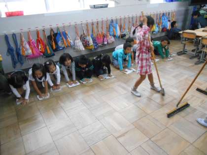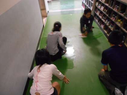 1枚目、1年の教室をのぞくと、横一列になってぞうきんがけをするとことでした。このあと、「12345。12345.」と言いながら一回ずつ床ぶきをして前に進みます。2枚目は、1階南トイレの前を4人がしっかりぞうきんがけをしているところを撮影しました。