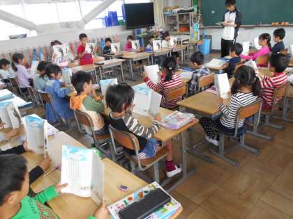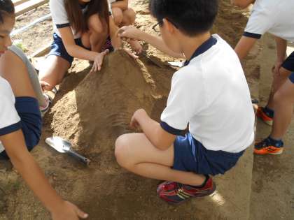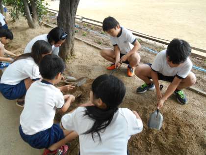 1枚目は一年生の国語です。教科書をしっかり立てていい姿勢で音読していました。2・3枚目は5年生の理科です。花壇の土を掘って山にし、てっぺんから水を流して、水の流れを観察しました。