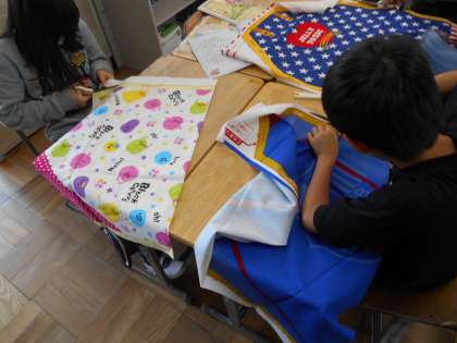 5年生が何やら作っていました。「何を作っているの?」「エプロンです。」とのこと。どれもかっこいい生地のものでした。