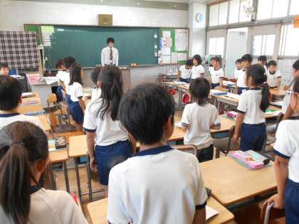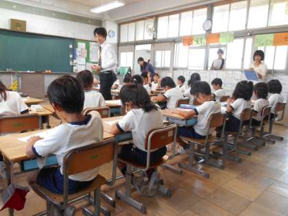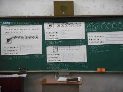 教育実習の先生の研究授業がありました。算数のかけ算の式の立て方を勉強しました。ていねいに教えてもらい、全員がわかったと思います。模造紙に問題を書き、準備にも時間をかけられていました。