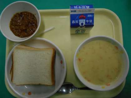 今日の給食は、ミートサンド、豆乳ポタージュ、食パン、牛乳でした。今日は忘れず、ミートサンドをパンにはさみました。
