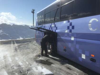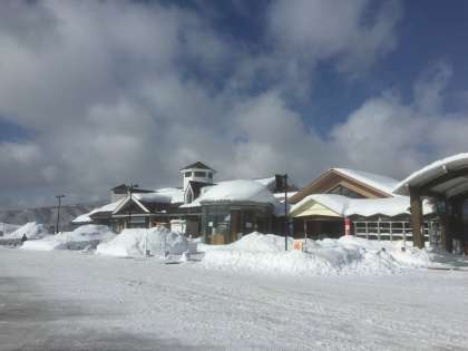 ひるがの高原サービスエリアでバスにチェーン装着をします。周りは一面雪です。郡上高原ホテルのゲレンデも想像できます。こちらは良い天気です。