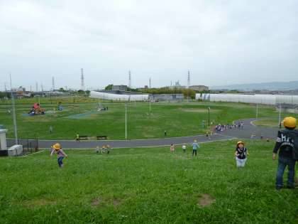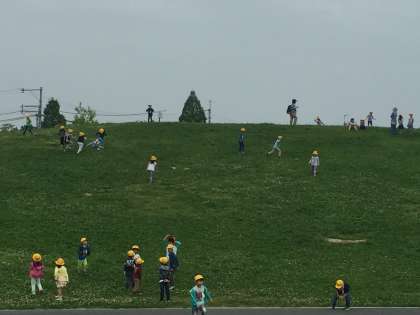 「草の広場」ではシロツメグサが沢山咲いていて、摘んで飾りを作っている子がいました。「草の丘」にもかけ上っていました。上からの景色も良かったです。