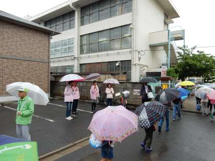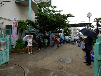 雨のスタートでしたが、今朝は、市民会議・民生委員・児童会の三つが一緒になってのあいさつ運動で、両門で「おはようございます。」のあいさつが交わされました。