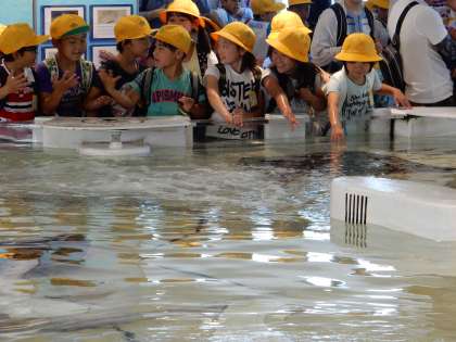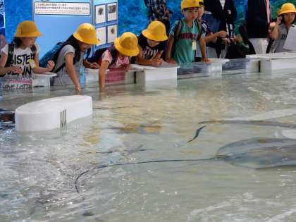 「タッチングプール」では、「エイ」と「サメ」を触ってその感触を知りました。