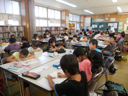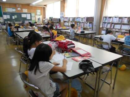 3年生の部は14時50分から、4年生の部は15時40分から図書室で学習教室を開放しています。わからないところがあれば黙って挙手。短時間ですが集中して取り組んでいます。