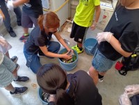 次は藍染め体験。学校で、ビー玉や割りばし、輪ゴムなどを使って絞ったTシャツに藍染...