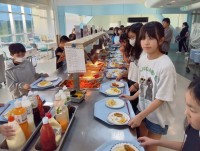 夕食の時間です。バイキング方式の夕食です。子どもたちは、好きなものをたくさん取っ...
