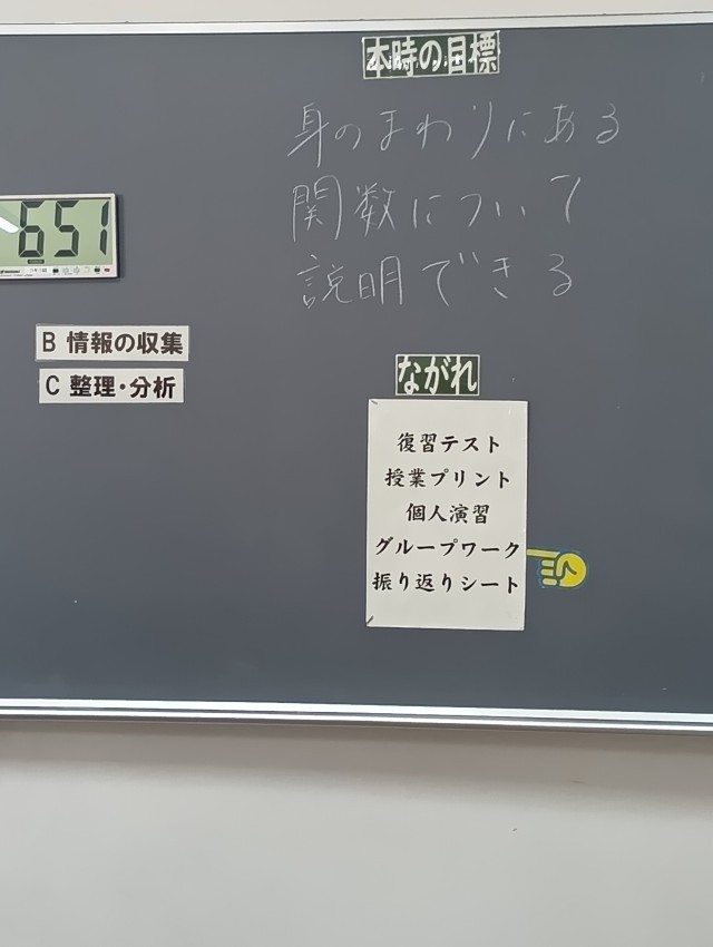 2枚め、3枚め、3年生数学では、「身の回りの関数について説明できる」という目標でグループで学習をしていました。