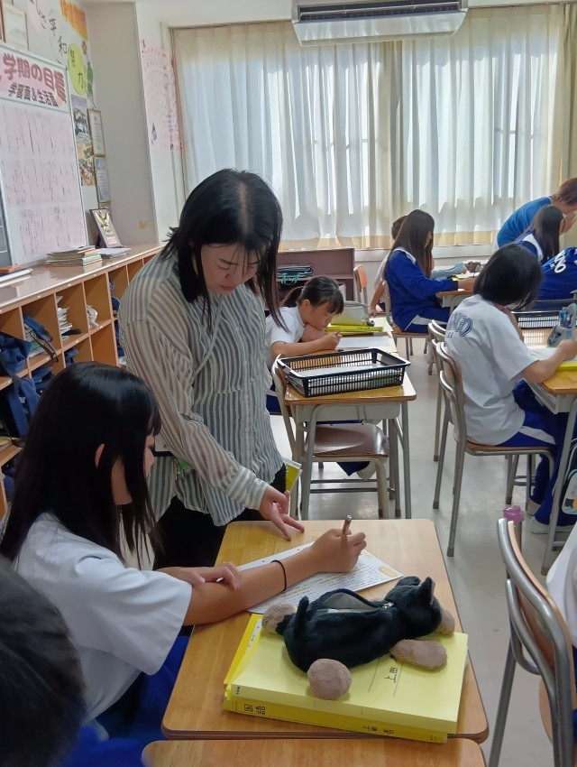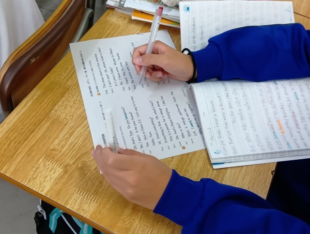 4枚め、5枚め、1年生英語では、英文の中で自分が分からない語句等、整理するために線を引きながら、これから自分が学習する課題を理解していました。