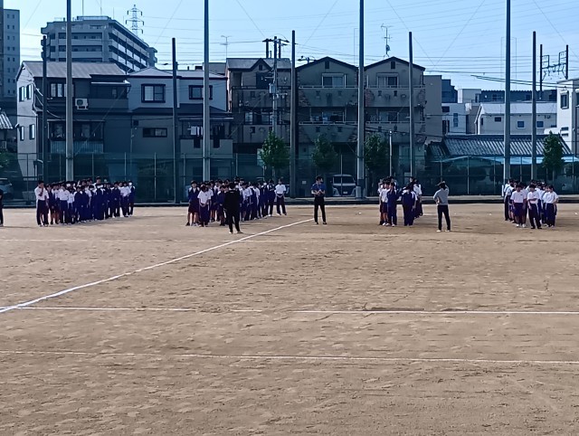 まず1時間目は3年生。生徒席の確認や開会式での入場の仕方、そしてラジオ体操に取り組みました。今年の体育大会は縦割りの団活動で実施されるため、最上級生である3年生のリーダーシップがこれまで以上に重要になります。