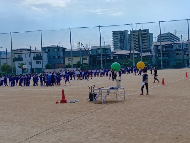 2時間目は2年生。ラジオ体操の後、大玉を使った学年種目の練習を行いました。