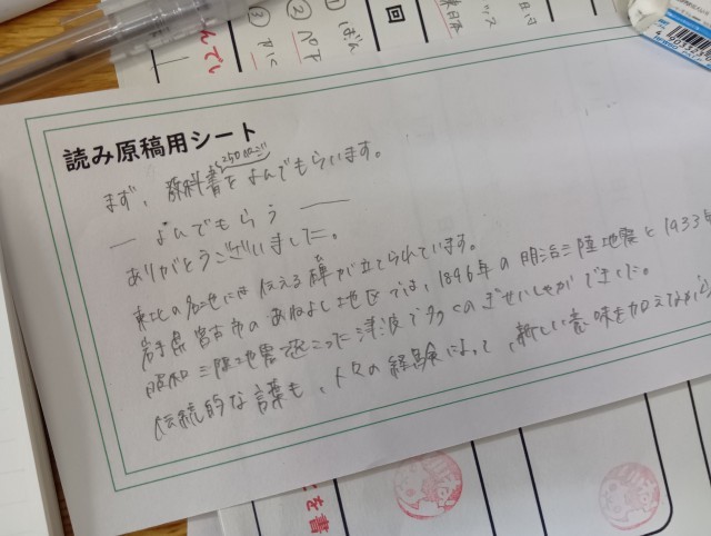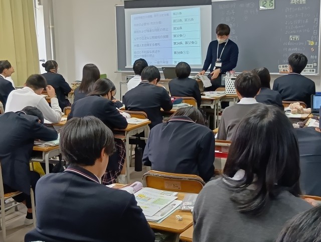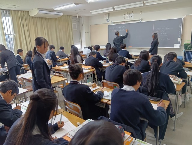 1枚め2枚め、2年生社会科では、東北地方の気候の特徴について、生徒が授業をおこなっていました。班ごとに分担したテーマで事前に授業内容を研究・準備し、授業をしていました。前で説明をする人や他の生徒の様子を見て回る人、黒板を書く人等分担していました。クラスメイトに質問もしながら、一生懸命取り組んでいました。その班の授業が終わったら、拍手が起きていました。