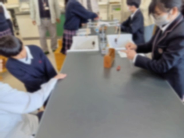 4枚め、1年生理科では、水素と酸素から水ができることを確かめる実験を班でおこなっていました。火を近づけると「ポン」という音が鳴って、歓声があがっていました。