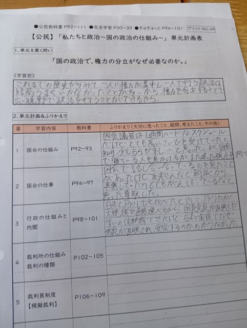 5枚め、3年生社会科では、裁判制度について学んでいました。6枚めは単元を通しての振り返りシートです。その日に学んだことをびっしり記しています。学んだことをアウトプットすることで、自分の知識の定着にもなります。