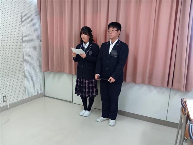 最初に、11月8日(土)に大阪府議会議場で開催された「大阪府中学校生徒会サミット」に参加した生徒会会長と副会長から報告があり、府内の色々な学校と交流したことを今後の活動に生かしたいという思いも伝えてくれました。