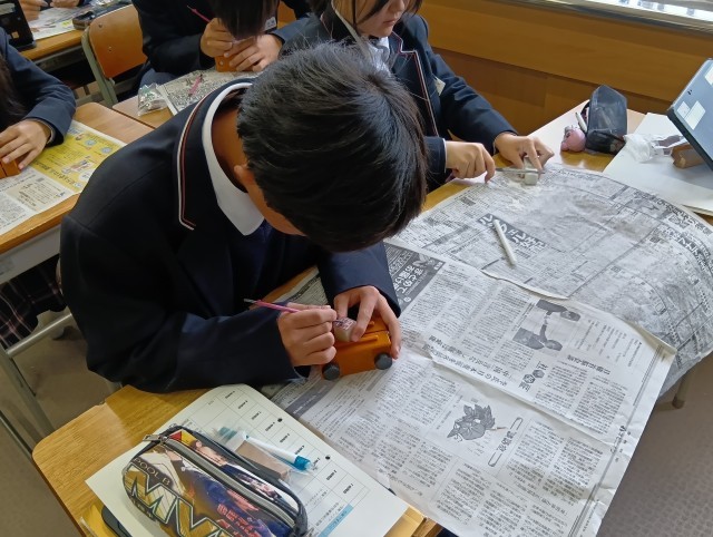 4枚め、5枚め、6枚めは、3年生美術では、篆刻(てんこく)をしていました。2学期はじめから考えていたデザインをもとに、石をけずり、ハンコにしていきます。根気強く丁寧に取り組んでいました。