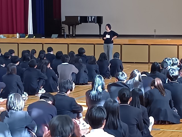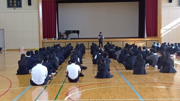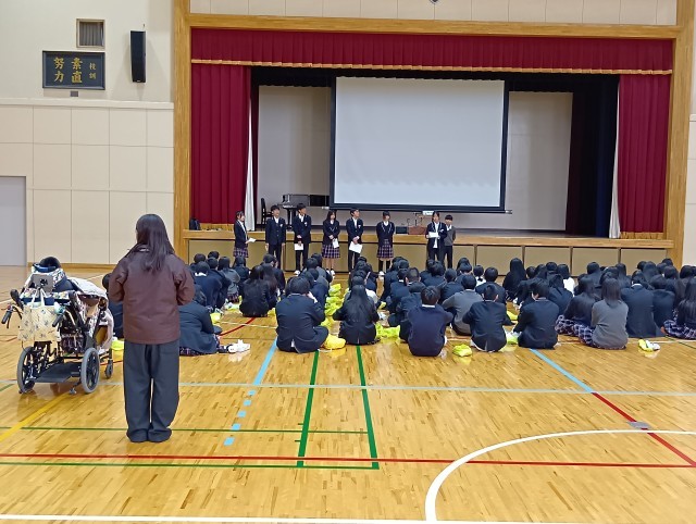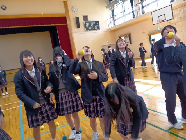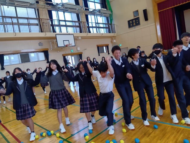 3年生は前半にレクレーションとして生徒からリクエストのあったダンシング玉入れをおこない大盛況でした。後半にはいろいろな先生から話がありました。「受験は団体戦。自分や他の仲間のためにしんどい時期でも勉強をがんばりましょう。」とお話がありました。