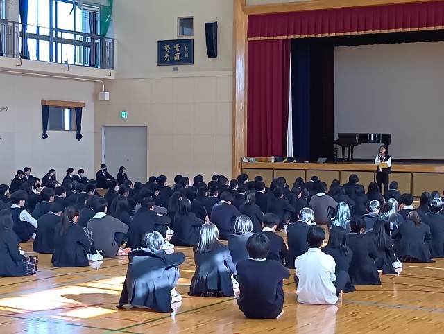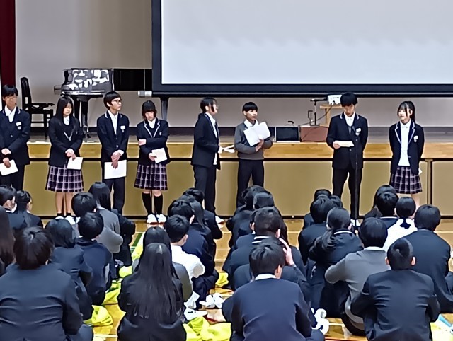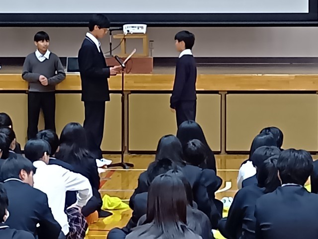 1年生は、学級委員会から各クラスの振り返りの発表がありました。姿勢よく話を聞き、拍手を送っていました。冬休みの提出物についての話などもありました。