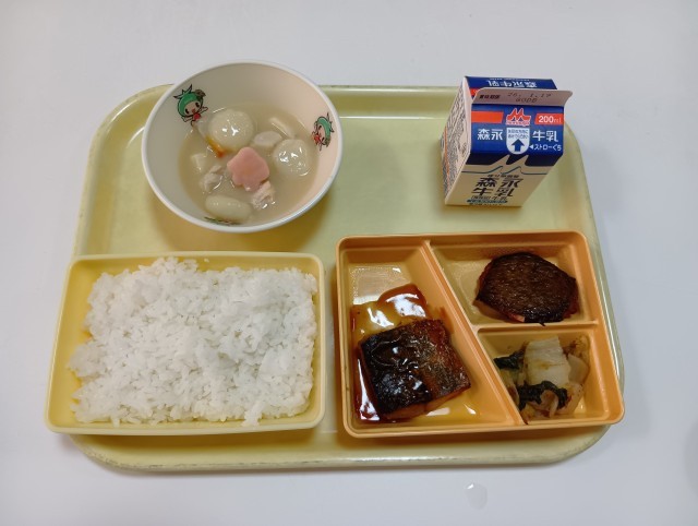 今日のメニューは正月献立で、「さわらの生姜あん・れんこんの磯辺揚げ・白菜のおかか・雑煮・白ごはん・牛乳」でした。