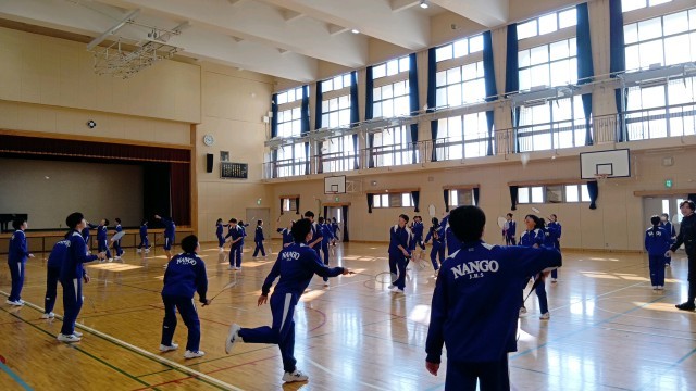 3年1・2組は、男女ともに体育館でバドミントンをおこなっていました。友人と向かい合ってシャトル(羽)を打ち合っていました。