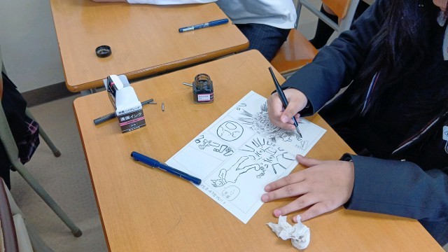 4枚め5枚めは2年美術で、インクとGペンを使い、キャラクター・ストーリー・コマ割りなども考えながら、オリジナルの漫画を描いていました。