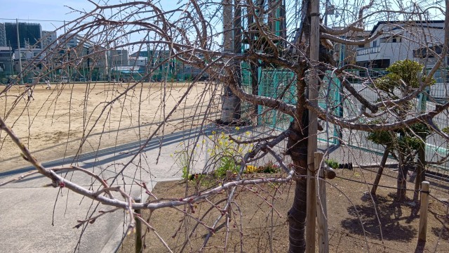 今日は暖かく、グラウンドにある桜の木々の蕾も少しずつ膨らんできました。