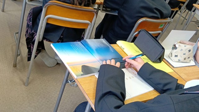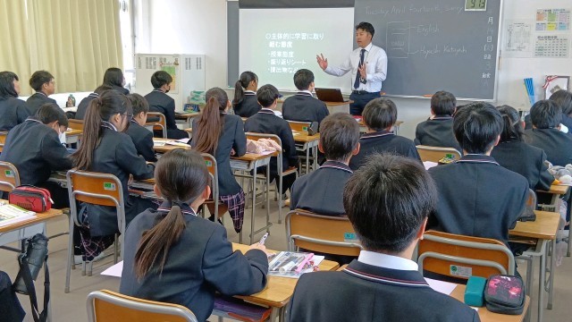 写真1~3枚め、1年生の社会・英語・国語の授業の様子です。教科の説明を受けていたり、真新しい教科書の1ページめを読んだりしていました。