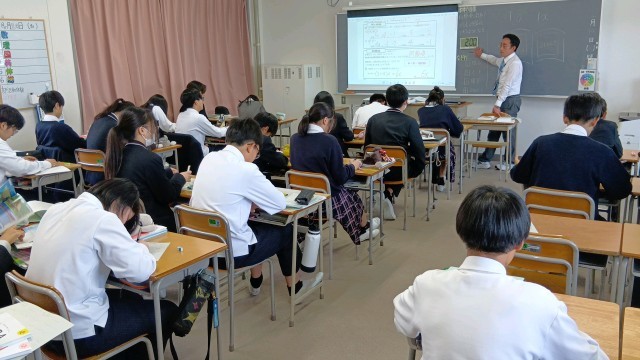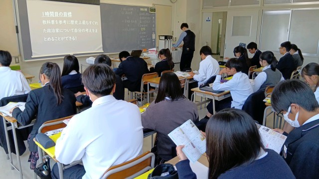 4~5枚め、3年生数学、社会科の授業の様子です。数学は個人思考の時間、社会は歴史上自分が最も優れた政治家を選んでいるところでした。