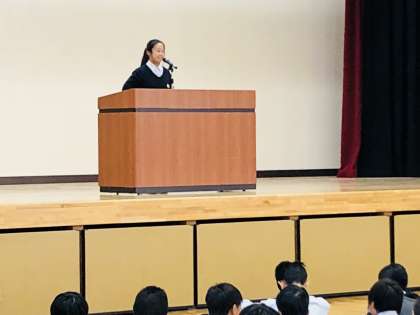 今日の全校集会では、明後日、サーティホールで行われる大東市小中学生弁論大会に参加する2年生の余田陽菜さんに、リハーサルを兼ねて弁論を発表してもらいました。