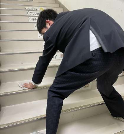 階段掃除の生徒が、一段一段と低い姿勢で丁寧に拭いてくれていました。