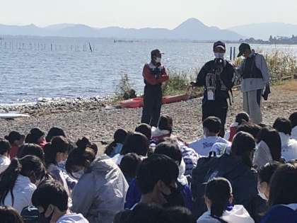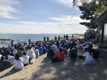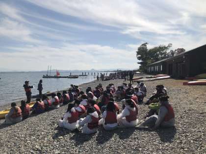 開校式です。しっかり注意事項を聞いて、いよいよカヤック、ヨットの体験です。