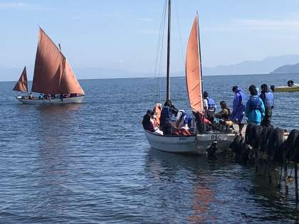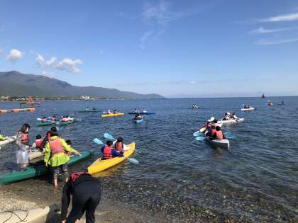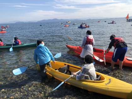 みんなとても楽しそうです。ヨット、1人カヤック、2人カヤックのグループに分かれて体験です。