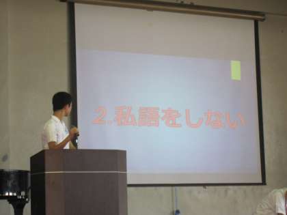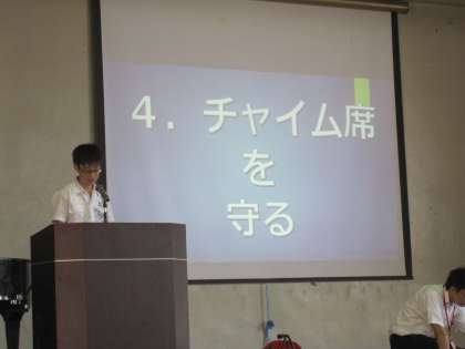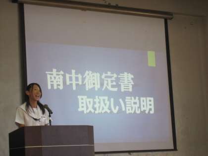 今日の全校集会で、生徒会役員からこれまで話し合ってきたことをまとめた8か条からなる「南中御定書」の提案・説明がありました。