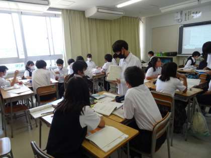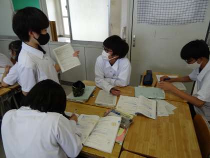 説明する生徒は、自分たちの班で話し合った内容についてより理解を深めることができます。また、説明を受ける生徒たちも自分たちの班で出た意見とは違う考えを聞くことができ、新たな気づきも生まれ、その内容をノートやプリントに書きこむ生徒の姿も見られました。