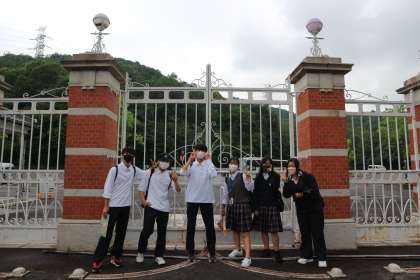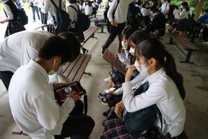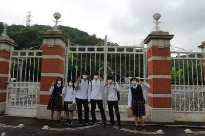 担当からのタブレットの使い方、ゲームの説明、第八高等学校正門前での様子です。