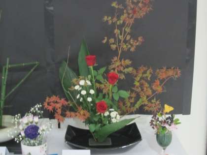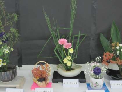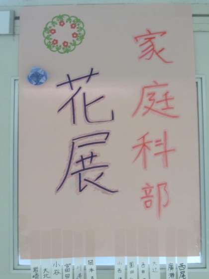 これからはしばらく展示の部の紹介をします。最初は家庭科部です。下足室前の廊下に「花展」として作品が展示されています。和みの空間になっています。