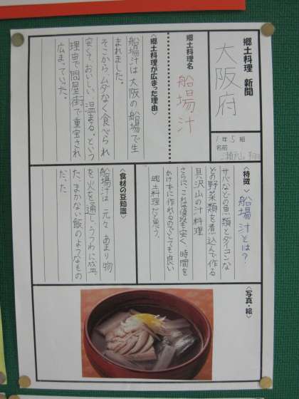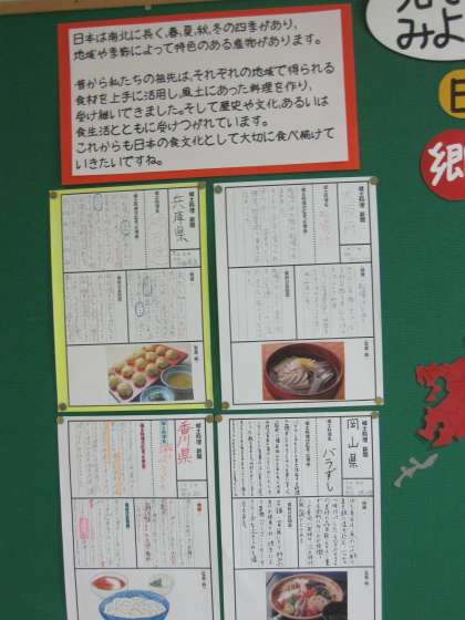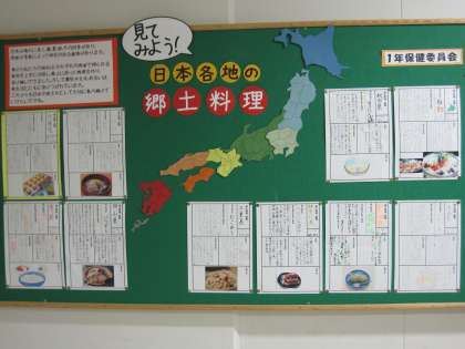 保健委員会は「和食」をテーマに日本の郷土料理について調べた内容を保健室前に展示しています。写真なども上手に使い、よくまとまっていて思わず「食べたい」と思う内容です。