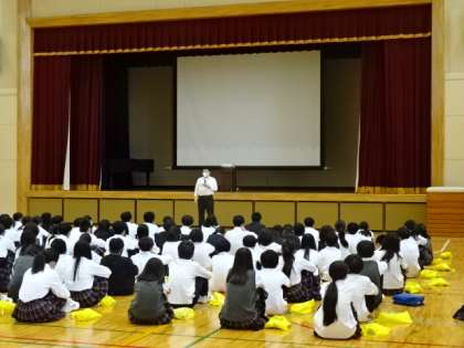 本日6時間目、1年生は四條畷警察の少年係係長に来ていただき体育館で非行防止教室を開催しました。