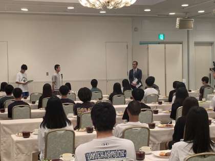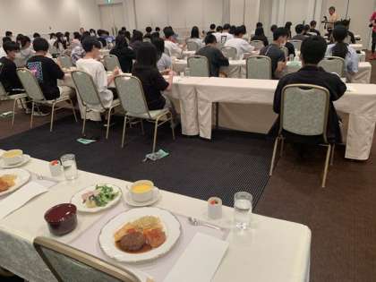 ホテルに到着し、入浴した後食事会場で入館式を行いました。