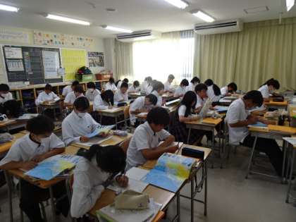 1年2組は社会で、地図帳を使って調べ学習を進めていました。
