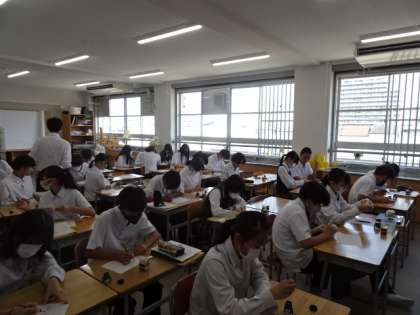 2年3組は美術で、これから学習を進めていくGペンの使い方について実際に書きながらその感覚を学んでいました