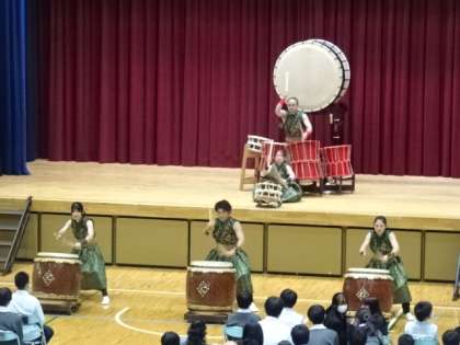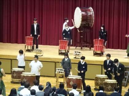 続いて、和太鼓の演奏が行われ、会場全体に力強い音が響き渡り、迫力ある演奏に圧倒されました。最後に、太鼓体験もさせていただき、学びの多い素晴らしい時間を過ごすことができました。
