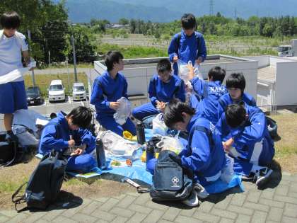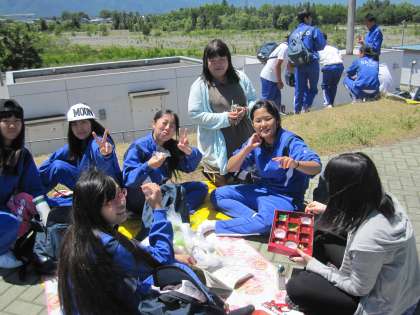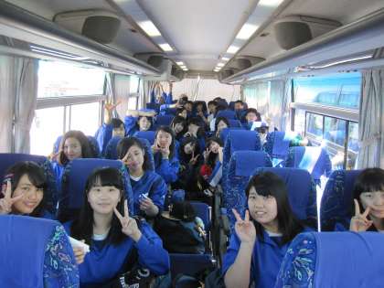 昼食風景の続きとトレッキングを選択した生徒のバス内の風景です。