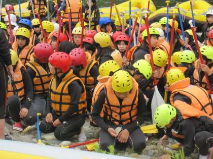 次はラフティングの準備を整え、犀川の河原に集合です。