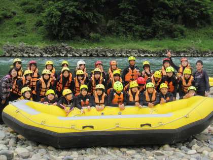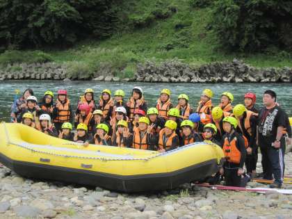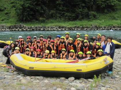 ラフティングにスタートする前のクラス写真です。