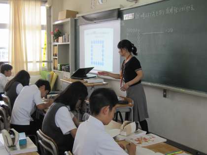 6月は授業交流期間として、先生どうしが授業を参観し合い、学び合う期間を設けています。その中で、ミニ研究授業を実施していますが、今日は1年6組で数学の研究授業でした。